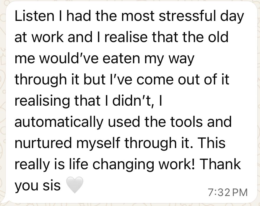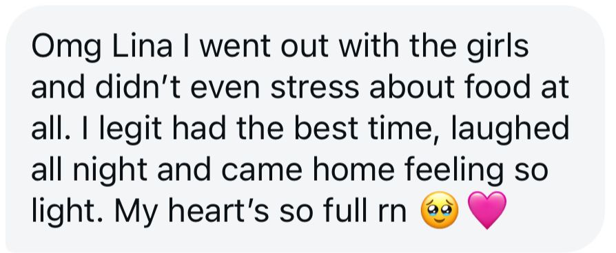 Nothing tops the feeling of finally trusting yourself. No more brain space occupied by obsessive food thoughts, or guilt after eating. This process works.